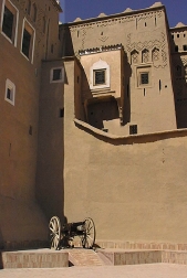 Back when the French were in control, one family pulled the strings in Ouarzazate: the Glaoui. Granted control of the entire south of Morocco in 1912, El Glaoui, the Pasha of Marrakesh and a friend of Winston Churchill, kept his pleasure palace in Ouarzazate. During the fat years, he would throw parties here where nothing was impossible. Hash, opium, gold, and little boys and girls were made available for the pleasure of the guests (read Gavin Maxwell's Lords of the Atlas for more). El Glaoui kept control over the town by keeping a cannon (rightmost photo) pointed right at Ouarzazate -- subtle, eh? When independence came in 1956, the townspeople returned the favor and sacked the palace. Now restored, the palace is frequently used in film shots; a set was being constructed right across the street during our visit.