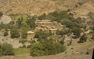 Having had our fill of Marrakesh "culture", we decided to check out a town smaller than any we've visited and readily accessible by bus. Ouarzazate (yow-zah-zaht) lies nestled in a valley in the High Atlas mountains, the range that separates the populated sections of Morocco from the Sahara desert. Our bus ride ran for much of the trip alongside a small riverbed that, to our amazement and despite the searing late summer heat, would frequently contain water. Even though we saw no mountain with snow on top, the water the snowmelt generates never quite gives out along this little valley. Small agricultural communities utilize the river and irrigation and maintain all sort of fields of grains, vegetables and fruit unbelievable given the searing heat and the dry, scrabble landscape. Most buildings are mud and hay constructions, nestled low and frequently built into the side of the mountains (photo below).