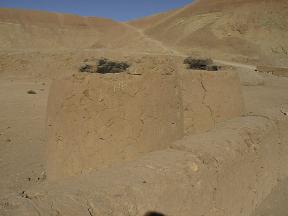From the top you can see what little remains of the Kasbah walls, and a bit of the surrounding desolation. In the below right photo, these apparent cisterns are actually upright baths that the townspeople would fill with water and then take turns bathing themselves.