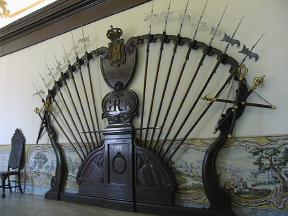Off the same square as the library is the University Chapel, built in 1517. Not as detailed as the wooden interiors we saw in Porto, the chapel is painted n a grand fashion. Near the chapel are a number of meeting rooms, within one of which we found this ancient set of arms with the abbreviation GRA on it. We joked that if a students admissions score fell too low, perhaps one of these beauties would be brought to bear.